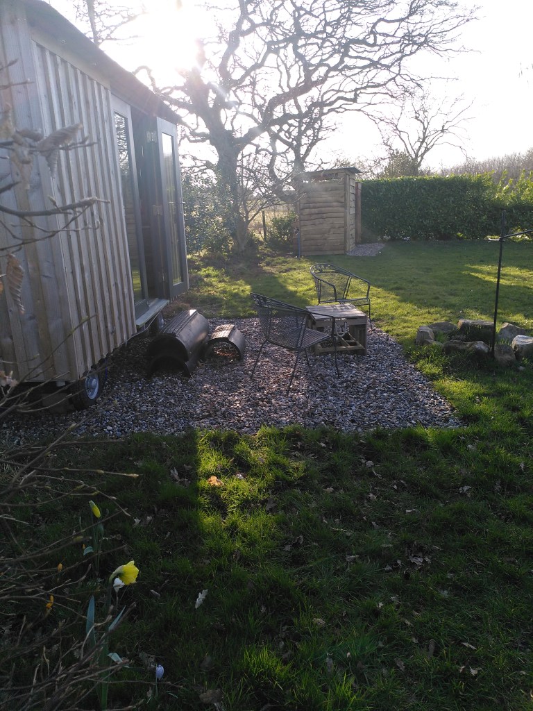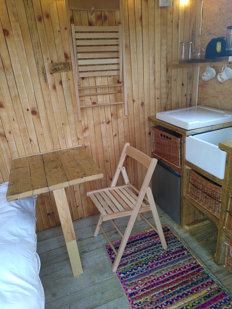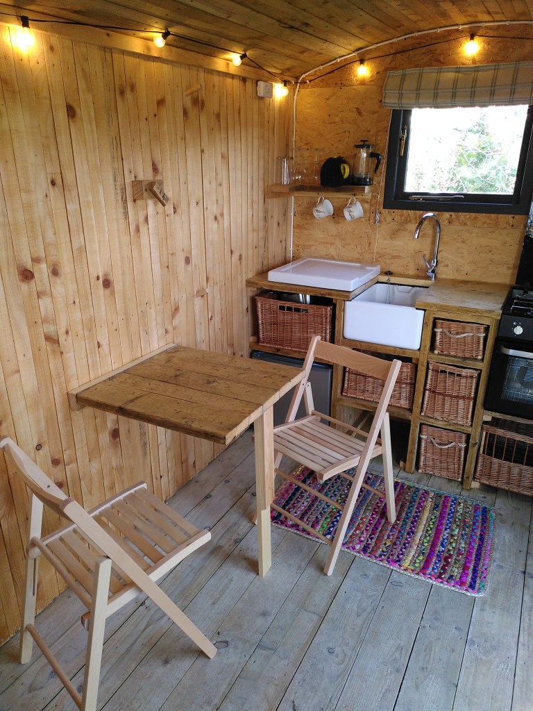 A fold away table & chairs give space to sit and eat when the weather isn’t great, otherwise you can cook outside at the fire pit.