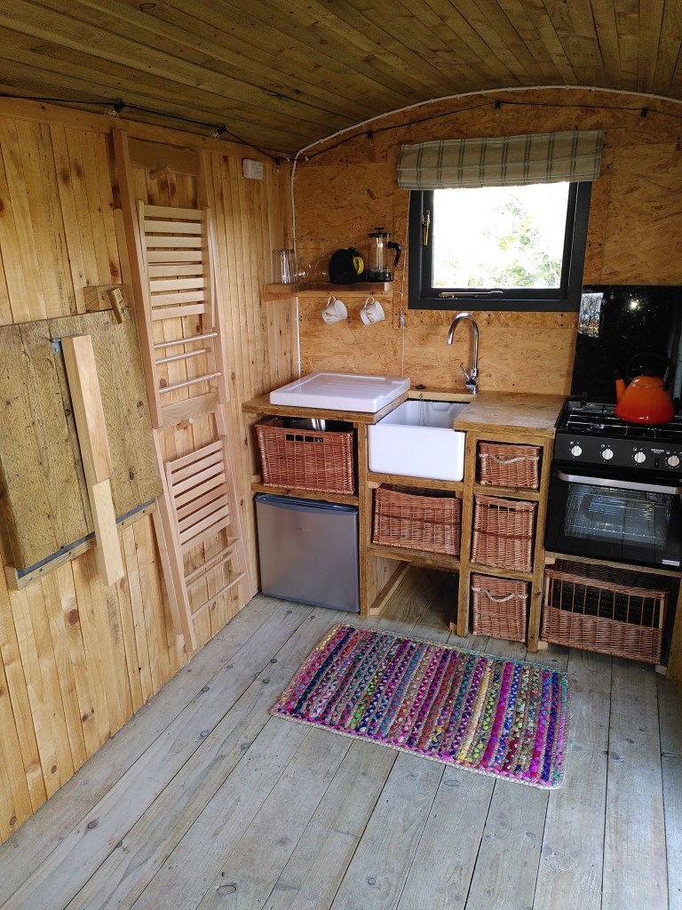 The equipped kitchen has a small fridge, small gas oven/grill & hob and sink with cold running water – warm it up with the whistling kettle on the hob.